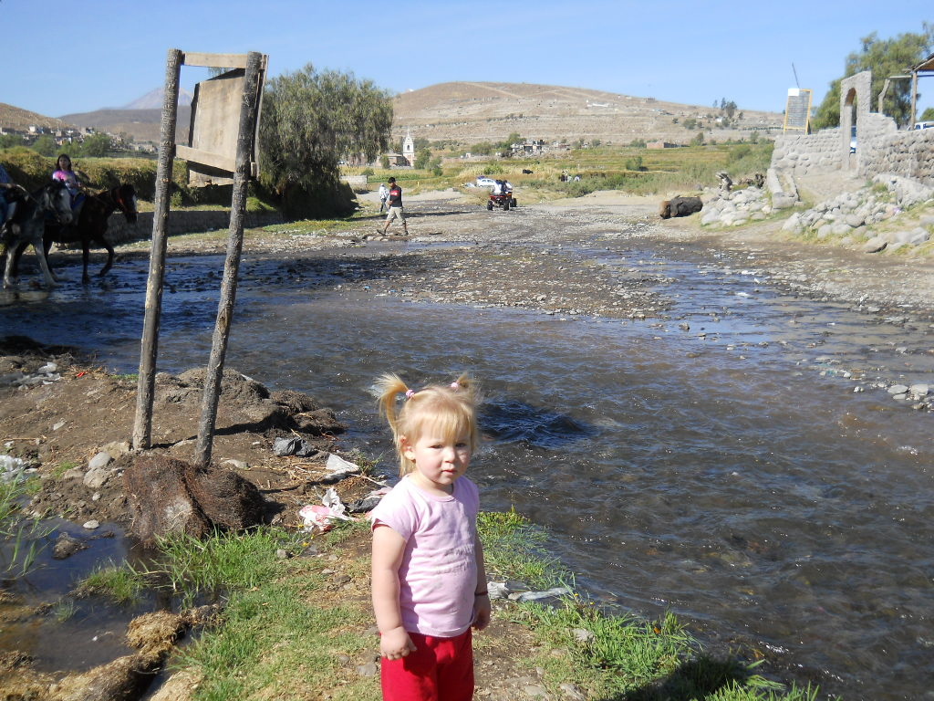 Hay caballos para pasear, un águila para tomarse fotos, patos, gallos, gallinas y gansos. Venden helados y queso helado que es un dulce típico arequipeño, que para mi es un helado que te lo ponen en un vaso plástico. Las cristalinas aguas del río recorren el verde lugar, donde claramente se ven los volcanes Chachani y Misti.